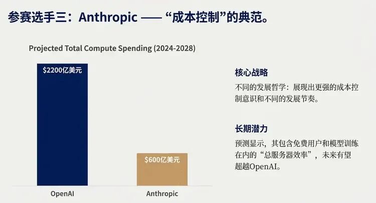 Anthropic则被分析师视为“效率控制”的典范。 尽管其付费业务利润率暂时落后,但预测显示其将在包含为免费用户运行AI模型和训练模型在内的“总服务器效率”上超越OpenAI。该公司规划的从明年到2028年的600亿美元总计算支出,远低于OpenAI同期的2200亿美元,展现出不同的发展节奏与成本控制哲学。