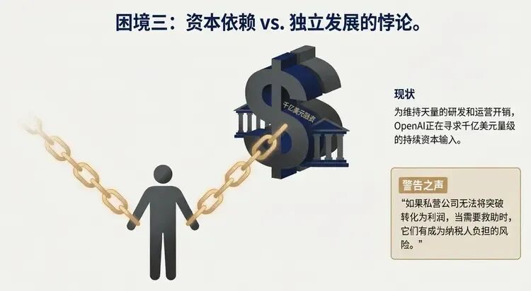 资本依赖与独立发展的悖论同样不容忽视。 OpenAI正在寻求1000亿美元量级的融资,这种对持续资本输入的依赖,与其追求的商业独立性形成了微妙张力。网友的警告值得深思:“如果私营公司无法将突破转化为利润,当需要救助时,它们有成为纳税人负担的风险。”