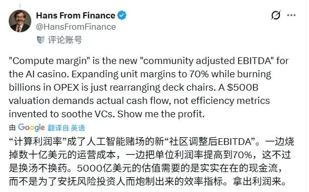 更多人则尖锐追问:在5000亿美元估值的光环下,为什么公司仍未盈利?“计算利润率”是否只是“AI赌场为安抚投资人发明的又一项指标”?