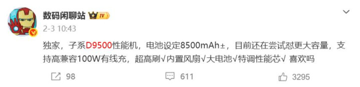 续航方面,电池设定最少有8500mAh,甚至会冲击9000mAh,并支持100w有线充电。